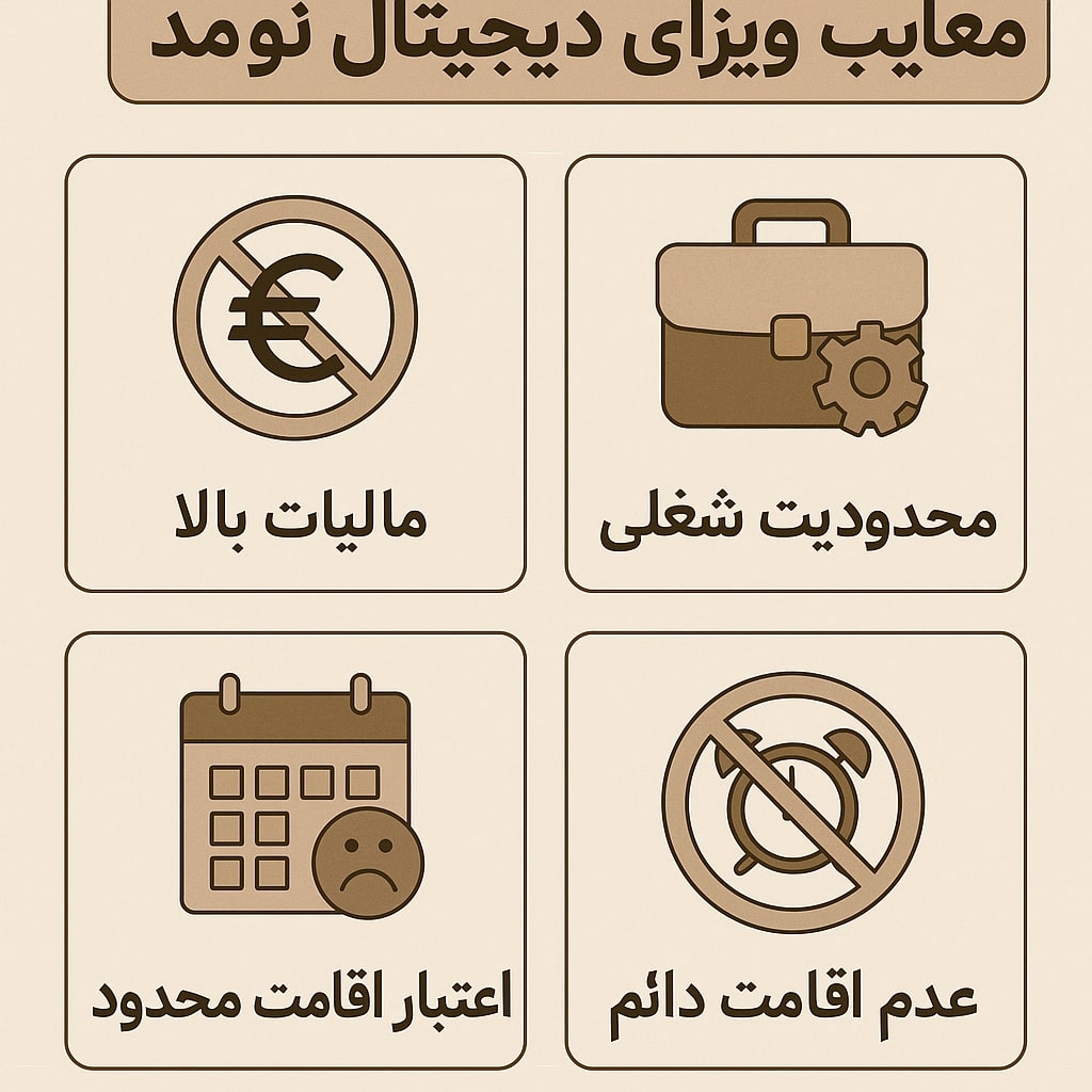 با وجود جذابیتهای فراوان، ویزای دیجیتال نومد اسپانیا خالی از معایب و محدودیت نیست. از مسائل مالیاتی و بیمهای گرفته تا هزینههای زندگی، محدودیتهای قانونی، مشکلات بانکی و حتی چالشهای فرهنگی، هر یک میتواند برای متقاضیان دردسرساز شود. نادیده گرفتن این موارد ممکن است به تصمیمی عجولانه منجر شود که در آینده مشکلات بزرگی برای فرد ایجاد کند. در این مقاله تلاش میکنیم با نگاهی تحلیلی و جامع، مهمترین معایب این ویزا را بررسی کنیم تا متقاضیان بتوانند با دیدی واقعبینانهتر مسیر خود را انتخاب نمایند.